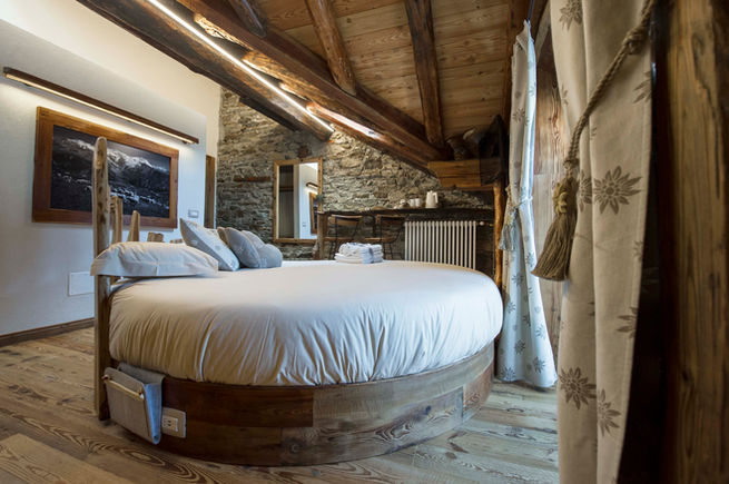 UN CERCHIO CHE SI CHIUDE. Il fascino di un sottotetto con travi a vista, la rivisitazione degli spazi, un letto rotondo che vi accompagnerà nei vostri sogni, le essenze del legno e la biosauna ad uso esclusivo riconcilieranno corpo e mente e infine una doccia di due metri completa l'originalità della camera.