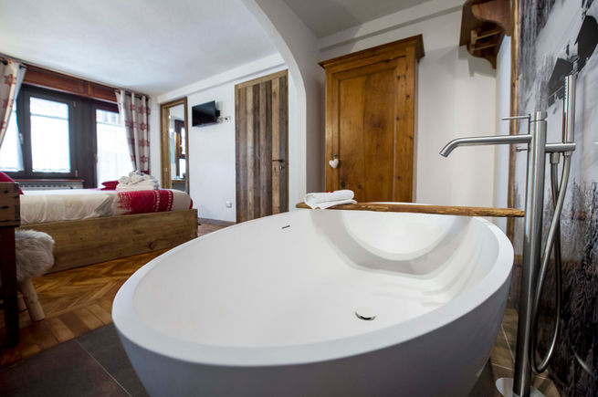 L'ELEGANZA DELLA SEMPLICITA'. Un connubio perfetto che caratterizza l'ambiente raccolto di una camera alpina e la linea semplice di una vasca nella quale ritrovare se stessi.